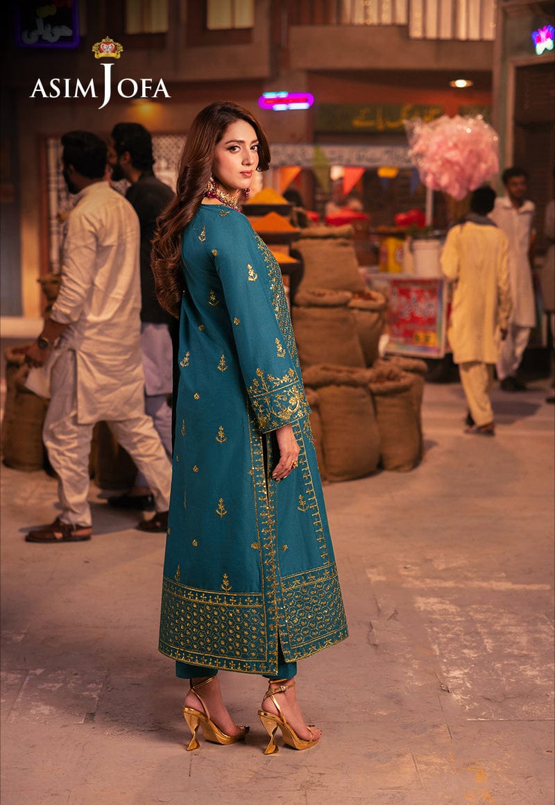 Embody the effervescent spirit of a happiness with this magnificent teal outfit. The teal shirt’s surface is brought to life with an intricate tapestry of embroidery, featuring captivating neckline and border with a dazzling display of craftsmanship where motifs of various sizes dance across the shirt like colorful bangles adorning happy arms. The shiny gold sequin work and antique gold zari work interweave throughout the embroidery, adding a touch of brilliance like tinkling bangles catching the sunlight. This symphony of embellishment is extended by an embroidered dupatta, embellished like a decorative bangle box, that makes this ensemble a breathtaking addition to your wardrobe