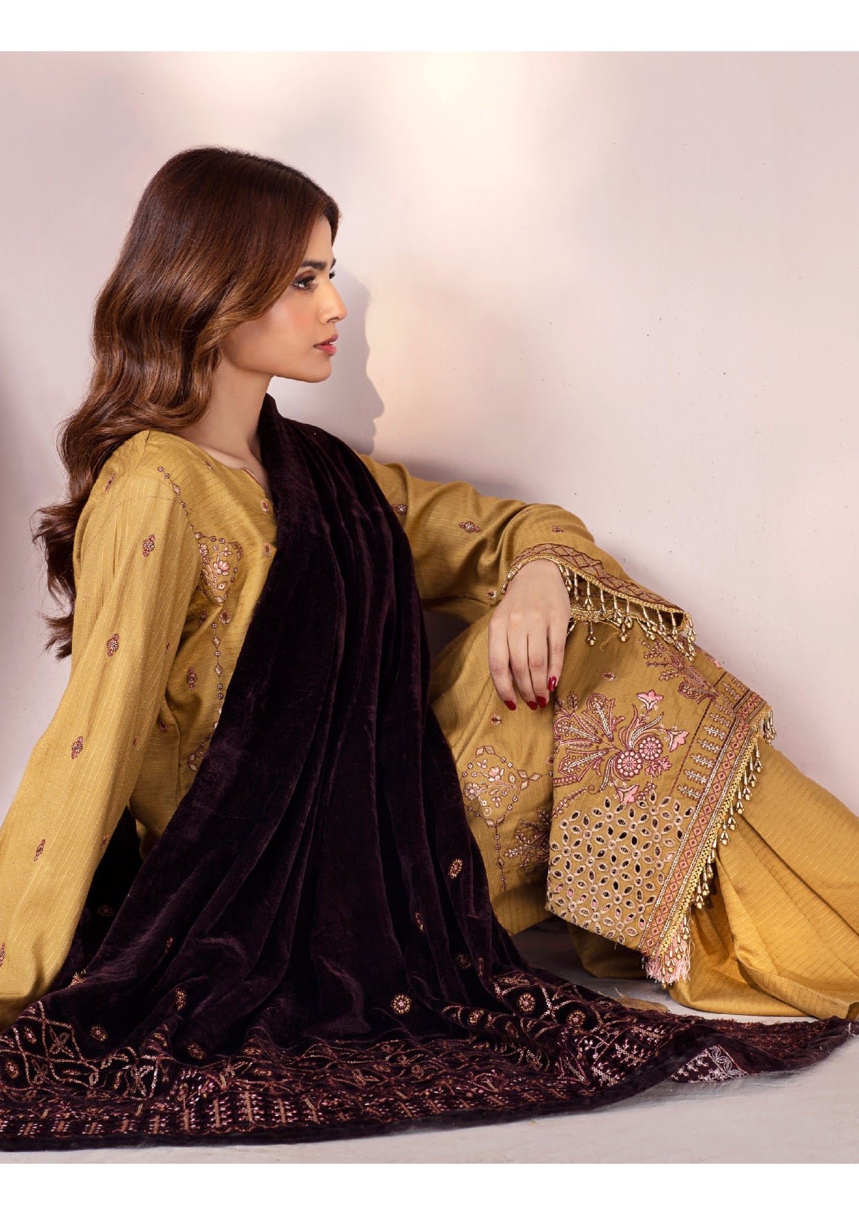 Each element is meticulously designed to reflect elegance, luxury, and cultural richness. The soft Dhanak fabric ensures comfort and warmth, while the velvet embroidered shawl adds a regal touch — perfect for festive gatherings or winter soirées.