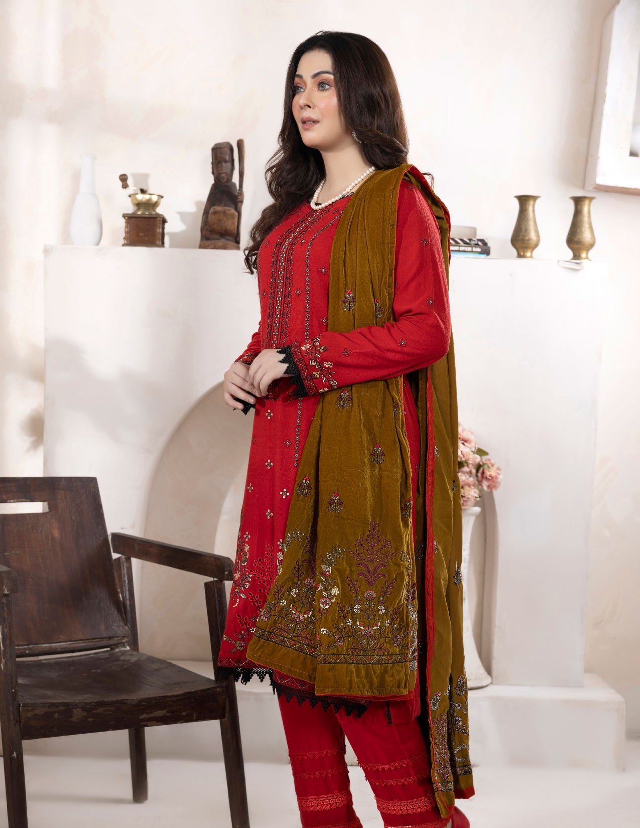 The richly embroidered patterns on soft slub fabric exude a graceful aesthetic, while the velvet shawl adds a touch of royal finesse. Perfect for winter festivities, family gatherings, and formal events, this ensemble captures the essence of Bareeze’s signature craftsmanship.