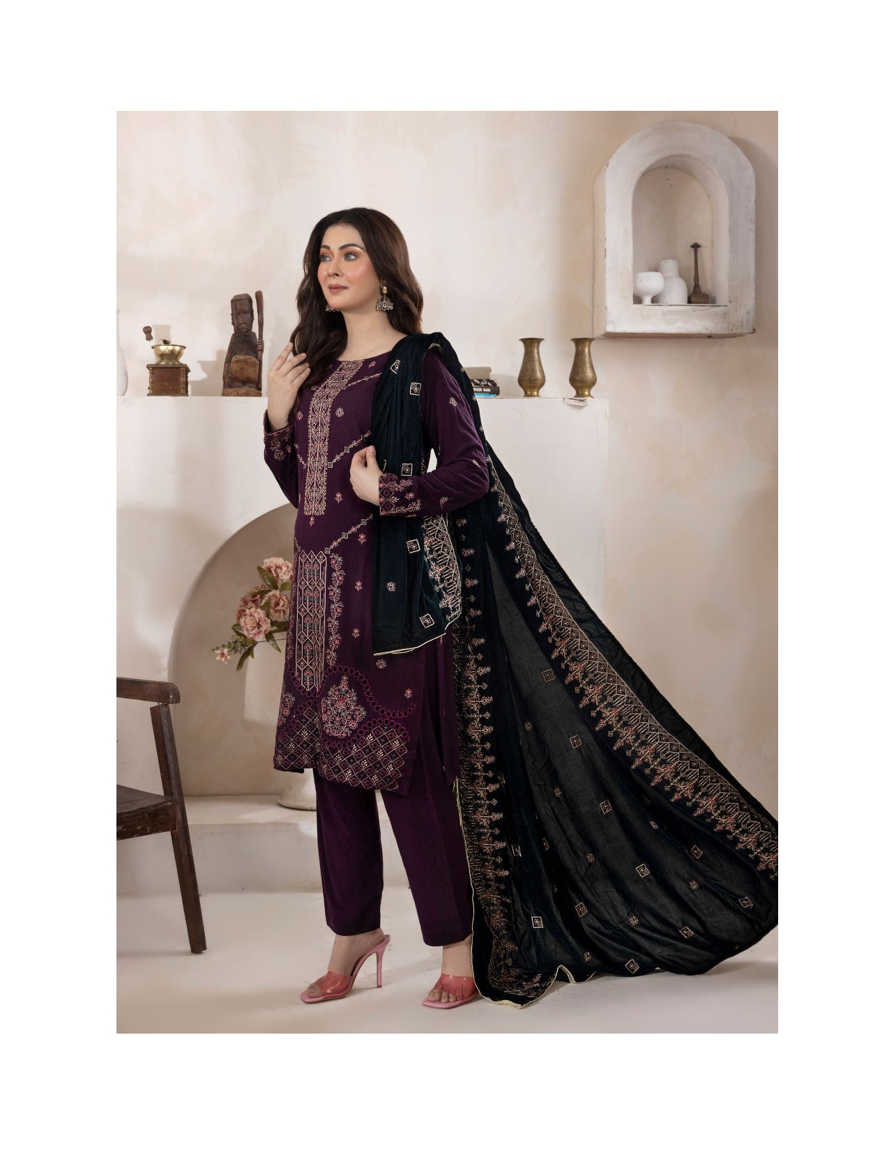 The richly embroidered patterns on soft slub fabric exude a graceful aesthetic, while the velvet shawl adds a touch of royal finesse. Perfect for winter festivities, family gatherings, and formal events, this ensemble captures the essence of Bareeze’s signature craftsmanship.