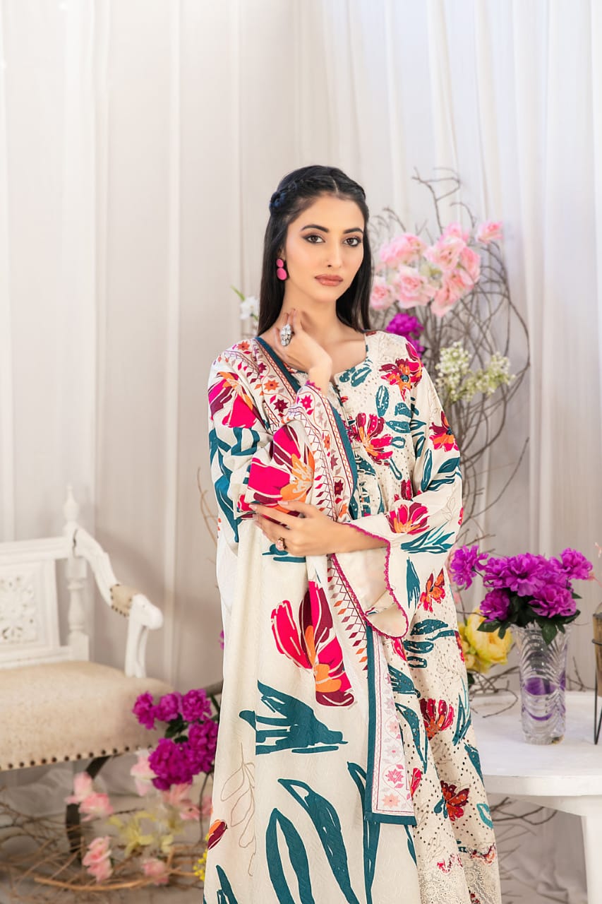 - Un-Stitched Daman Embroidered with Heavy Schiffli Jaal Digital Printed Viscose Front with Digital Printed Viscose Back & Sleeves Designs