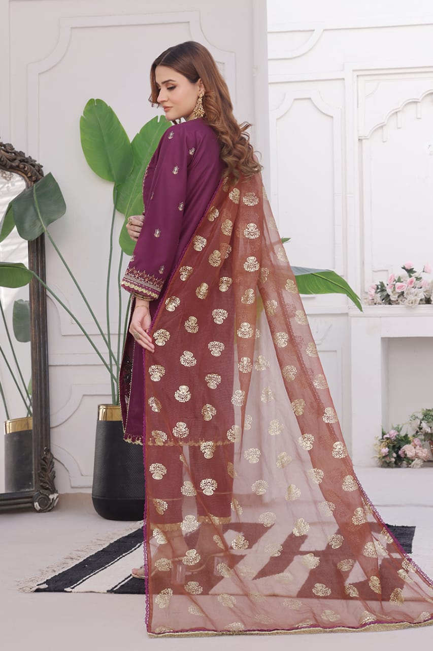 A luxurious organza slub dupatta (2.50m) with foil printing, adding a soft shimmer and festive charm to your outfit.